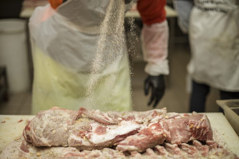 Si prosegue con la speziatura: una miscela di pepe nero, rosmarino, aglio ed aromi abruzzesi, con l’intento di conferire al prodotto finale un retrogusto equilibrato e meno aggressivo rispetto alle classiche versioni in circolazione. La priorità è non coprire la carne, ma valorizzarla.